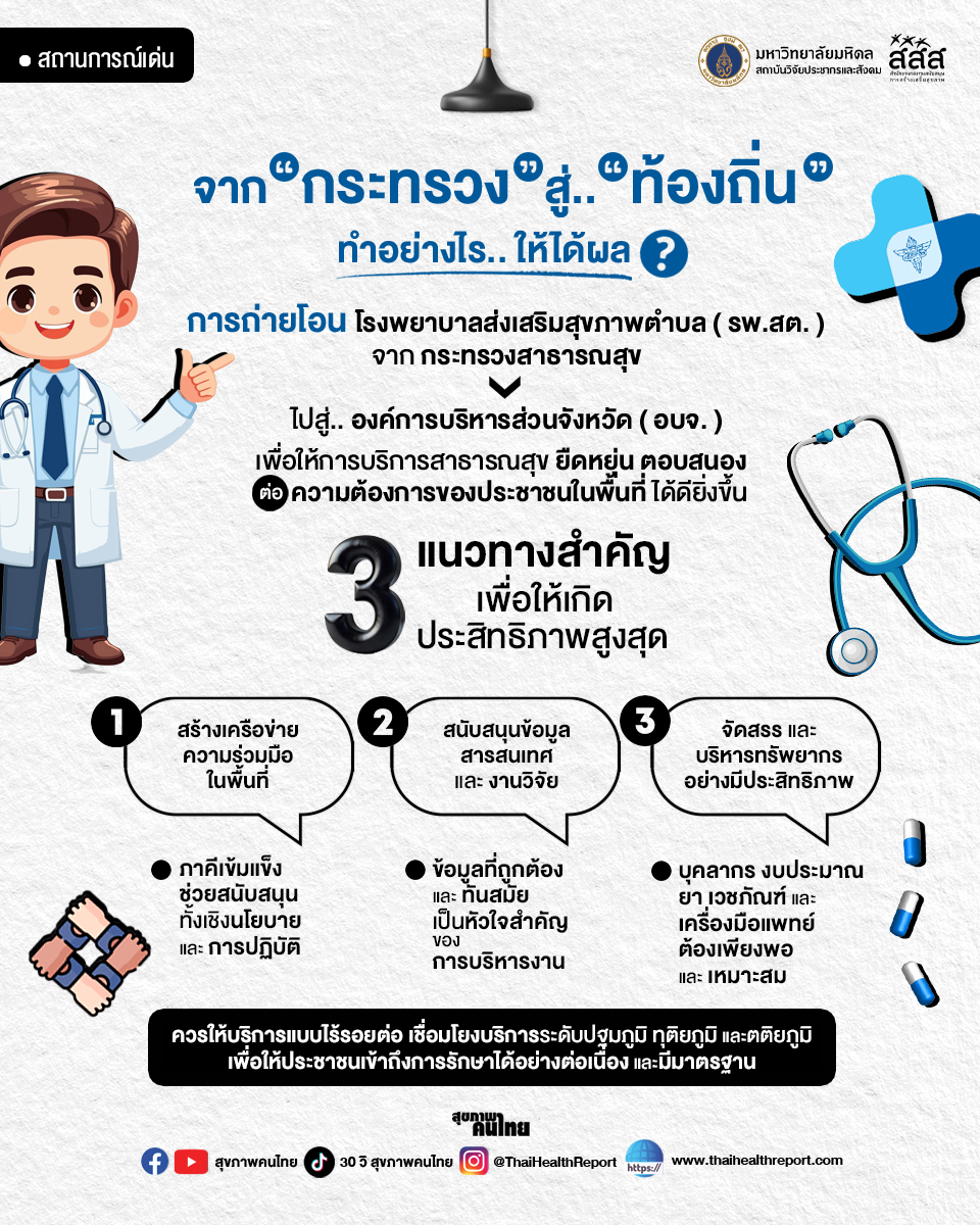 นอกจากนี้ การดำเนินงานยังต้องให้ความสำคัญกับการสร้างระบบบริการที่ไร้รอยต่อ โดยเชื่อมโยงบริการระดับปฐมภูมิ ทุติยภูมิ และตติยภูมิ เพื่อให้ประชาชนสามารถเข้าถึงการรักษาได้อย่างต่อเนื่องและมีมาตรฐาน กระทรวงสาธารณสุข กระทรวงมหาดไทย และ อบจ. ควรร่วมมือกันจัดเวทีแลกเปลี่ยนเรียนรู้และถอดบทเรียน เพื่อปรับปรุงแนวทางการดำเนินงานให้มีประสิทธิภาพสูงสุด การบูรณาการการทำงานอย่างเป็นระบบจะช่วยให้การถ่ายโอนภารกิจนี้เกิดประโยชน์สูงสุดแก่ประชาชนในพื้นที่