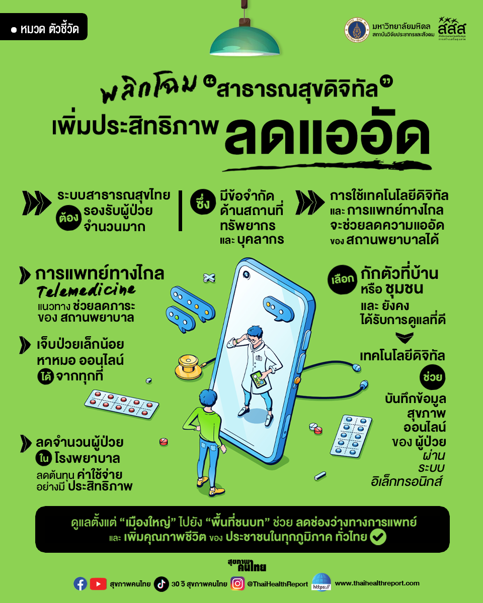 การแพทย์ทางไกล เป็นหนึ่งในแนวทางที่ช่วยลดภาระของสถานพยาบาล โดยเปิดโอกาสให้ผู้ป่วยที่มีอาการเล็กน้อย สามารถรับคำแนะนำจากแพทย์ผ่านระบบออนไลน์ได้จากที่บ้าน การให้บริการลักษณะนี้ช่วยลดจำนวนผู้เข้ารับบริการในโรงพยาบาล นอกจากนี้ ผู้ป่วยยังสามารถกักตัวที่บ้านหรือในชุมชนโดยยังคงได้รับการดูแลที่มีประสิทธิภาพ เทคโนโลยีดิจิทัลมีบทบาทสำคัญในการพัฒนาระบบสาธารณสุขของไทย ไม่ว่าจะเป็นระบบบันทึกสุขภาพอิเล็กทรอนิกส์ แอปพลิเคชันให้คำปรึกษาทางการแพทย์ และแพลตฟอร์มต่าง ๆเทคโนโลยีเหล่านี้ช่วยให้ประชาชนเข้าถึงบริการทางการแพทย์ได้สะดวก รวดเร็ว และลดต้นทุนการดำเนินงานของโรงพยาบาลได้อย่างมีประสิทธิภาพ