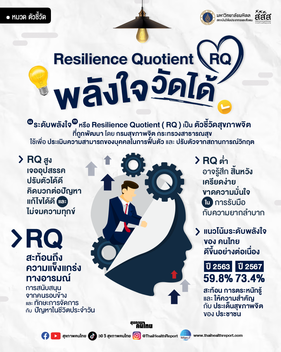 ระดับพลังใจ หรือ Resilience Quotient (RQ) เป็นตัวชี้วัดสุขภาพจิตที่พัฒนาโดยกรมสุขภาพจิต กระทรวงสาธารณสุข ซึ่งใช้ในการประเมินความสามารถของบุคคลในการฟื้นตัวและปรับตัวจากสถานการณ์วิกฤต RQ ไม่เพียงสะท้อนถึงความแข็งแกร่งทางอารมณ์ แต่ยังรวมถึงการได้รับการสนับสนุนจากคนรอบข้าง และทักษะการจัดการกับปัญหาในชีวิตประจำวัน