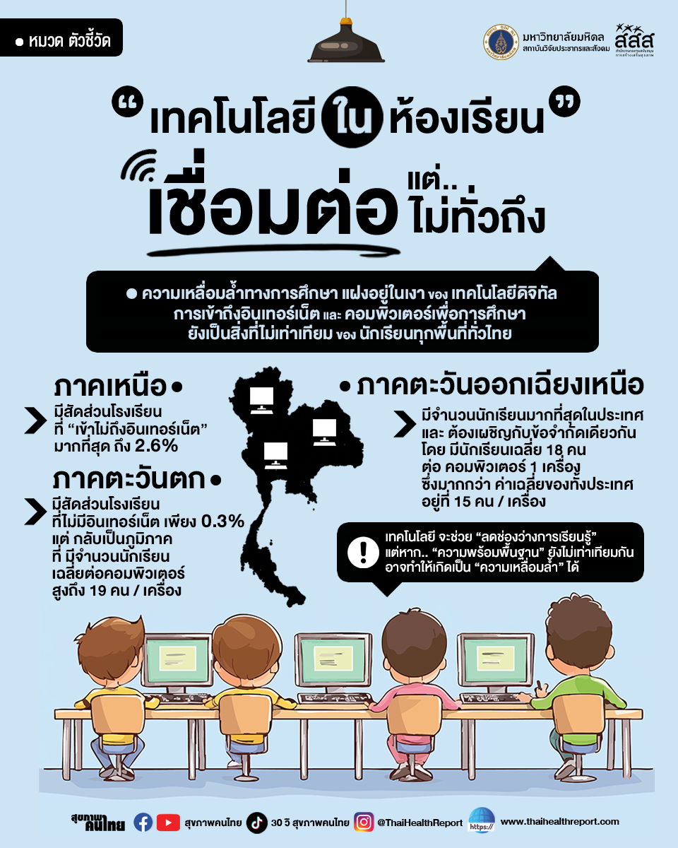 ในยุคที่เทคโนโลยีดิจิทัลกลายเป็นหัวใจของการเรียนรู้ การเข้าถึงอินเทอร์เน็ตและอุปกรณ์ไอทีพื้นฐาน เช่น คอมพิวเตอร์เพื่อการศึกษา ควรเป็นสิ่งที่นักเรียนทุกคนสามารถเข้าถึงได้อย่างเท่าเทียม ข้อมูลจากInternational Telecommunication Union Development Sector ปี 2022 ชี้ให้เห็นถึงความเหลื่อมล้ำทางการศึกษาที่แฝงอยู่ในเงาของเทคโนโลยี พบว่า ภาคเหนือ มีสัดส่วนโรงเรียนที่ เข้าไม่ถึงอินเทอร์เน็ตมากที่สุด ถึง 2.6% ขณะที่ ภาคตะวันตก แม้มีสัดส่วนโรงเรียนที่ไม่มีอินเทอร์เน็ตเพียง 0.3% แต่กลับเป็นภูมิภาคที่มีจำนวนนักเรียนเฉลี่ยต่อคอมพิวเตอร์สูงถึง 19 คนต่อเครื่อง ซึ่งถือว่าสูงที่สุดในประเทศ หมายความว่าแม้จะมีอุปกรณ์ แต่การเข้าถึงของนักเรียนแต่ละคนก็ยังจำกัด